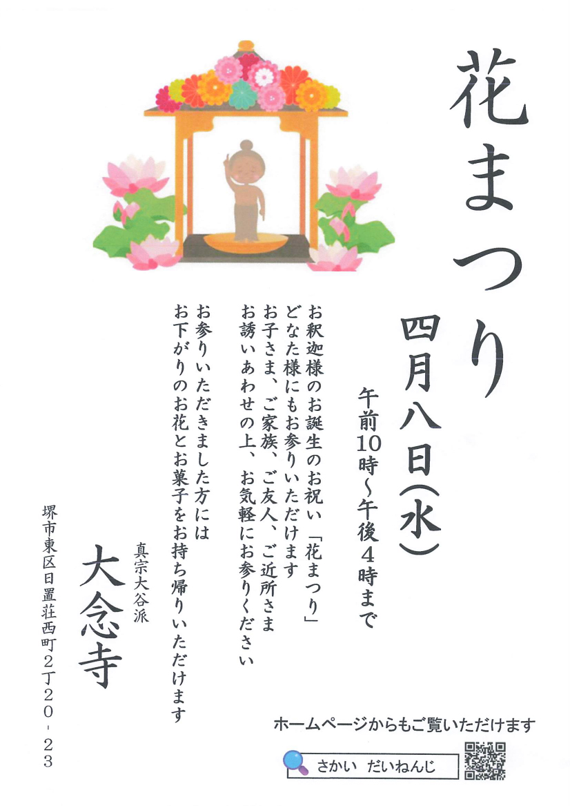 そのお釈迦さまの教えを聞き、感謝し、誕生をお祝いしましょう。宗派を問わず、お子様からご年配の方まで、お気軽に皆榛お誘い合わせの上、ご参拝ください。多数の方々のご参拝をお待ちしております.